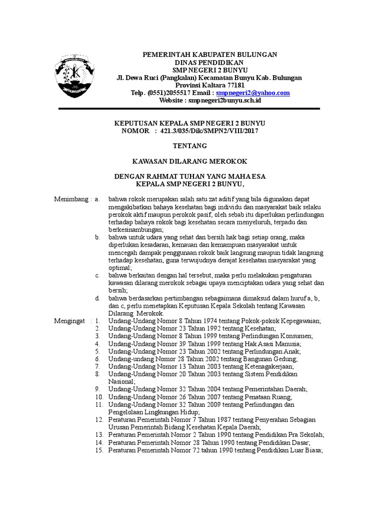 Buat SK tentang Penanggung jawab dan Pengawas KTR b. Contoh sk larangan merokok di sekolah. Dalam rangka mendukung kebijakan ktr di lingkungan sekolah sekolah wajib melakukan ketentuan sebagaimana diatur dalam peraturan menteri pendidikan dan kebudayaan nomor 64 tahun 2015 tentang kawasan tanpa rokok di lingkungan sekolah seperti memasukkan larangan terkait merokok dalam tata tertib sekolah menolak penawaran iklanpromosi.
